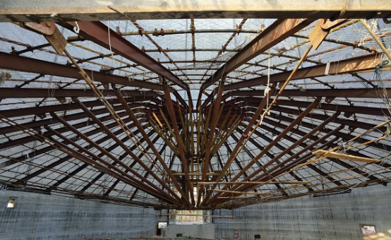 体系设计优化,拼装提速。“钢筋混凝土筒仓锥壳顶板架空支撑施工工法”依托粮食类筒仓工程,筒仓建筑高度高达50米,内径26米,仓顶设计为锥壳顶、平顶双层结构,斜锥壳板厚0.2米。以往筒仓仓壁一般采用滑模施工,锥壳顶板施工复杂,一般采用H型钢组装成圆柱形核心筒、外辐射钢桁架平梁的方式组装成支撑平台,重21.9吨,用钢量大,制作成本高;节点连接采用焊接,拼装速度慢,无法满足群体筒仓的周转时效。分公司针对传统做法的弊端,组织科研小组,专项研究,破解难题,最终形成了空间钢桁架——拉索组合结构支撑体系。该体系摒弃了3.2米直径的圆柱型核心筒,采用直径2.6米的伞状中心筒,通过五道环梁环向拉接,无需设置斜撑,原结构减轻将近1吨,节约了制作成本,而且承压能力更强。重点节点还改用了高强螺栓连接代替焊接,拼装速度明显提升,施工速度更快。